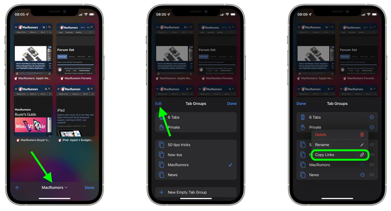 Sekme Grubunu açın, ekranın altındaki grubun adına dokunun, ardından Sekme Grupları kart menüsünün sol üst köşesindeki Düzenle’ye dokunun. Söz konusu Sekmeler Grubunun yanındaki daire içine alınmış üç noktaya dokunun, ardından Bağlantıları Kopyala’yı seçin.